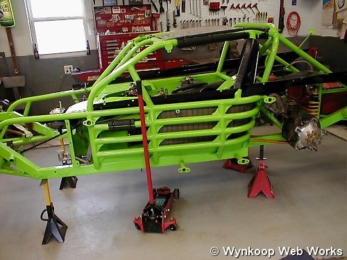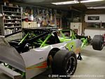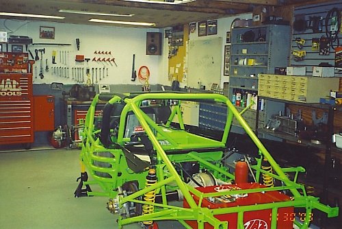 The B-Mod frame, in bright green, sits in the new shop waiting to be finished