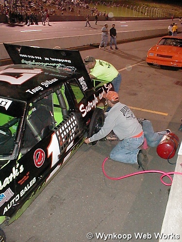 Uncle Chris and crew prepare Tony's street stock for the feature on 6-11-04 at Chemung Speedrome