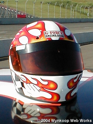 Tony's flashy new 2004 helmet sits atop his car. Matt's is the same design, only black.